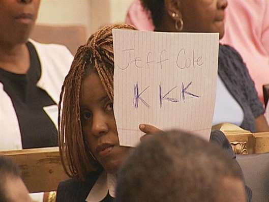 answers, and that's when the hand-made, accusatory signs came out.