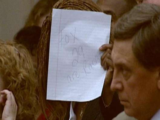 chambers and held up hand-written signs accusing Fox 29 and Cole of